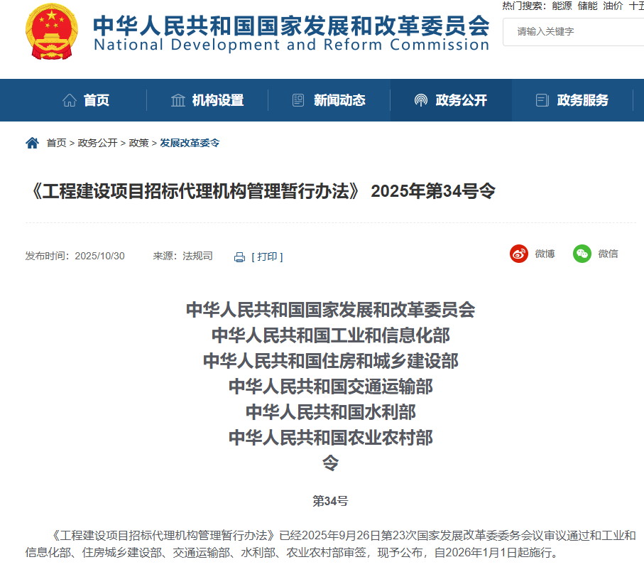 《工程建設項目招標代理機構管理暫行辦法》已經2025年9月26日第23次國家發展改革委委務會議審議通過和工業和信息化部、住房城鄉建設部、交通運輸部、水利部、農業農村部審簽,現予公布,自2026年1月1日起施行。